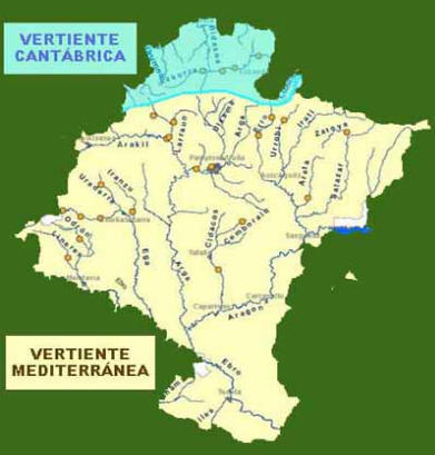 La Vertiente Mediterránea: Todo el territorio de Navarra que desagua en el Mediterráneo (9.302,08 Km2) lo hace a través del río Ebro, al que llegan a través de diversos afluentes, como el Ega, Arga Y Aragón. Las precipitaciones son muy variables durante el año, generalmente escasas en verano y más abundantes en invierno. Los ríos son bastante más largos que los del Cantábrico y presentan caudales mayores y cuencas más amplias. El río Ebro casi duplica el caudal en su transcurso por Navarra, pasando de los 137,5 m3/seg. en Mendavia, a los 237,08 m3/ seg. en Castejón.