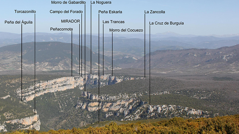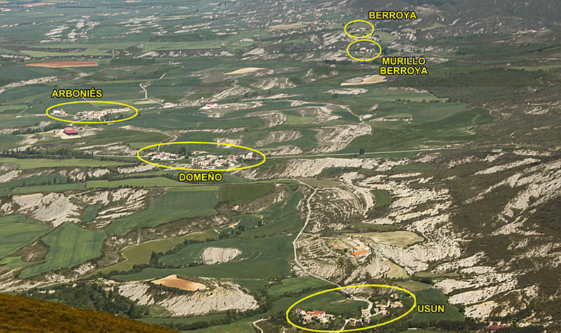 Vemos también toda la delimitación de los territorios de Romanzado y de Castillonuevo. Al N y al S las sierras de Illón y de Leire respectivamente, están formadas por calizas y dolomías, estas muy arenosas, que pertenecen al Cretácico Superior y al Paleoceno y por calcarenitas del Eoceno.