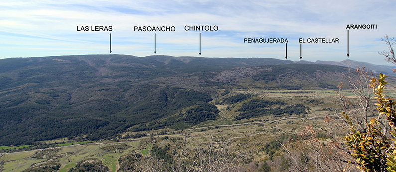 Las cumbres del Castellar, Peñagujerada (Paso del Oso), Chintolo y Pasoancho despuntan de W a E por el cordal de la sierra en el término de Romanzado. En el término de Castillonuevo lo hacen de W a E, las cumbres de Las Leras, Pasopetón (Escalar), El campo de la Peña y El Paco de Borrreguil.