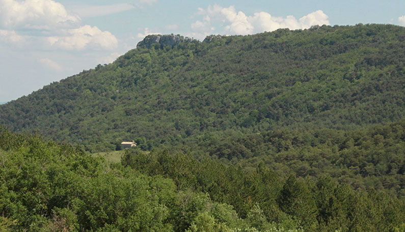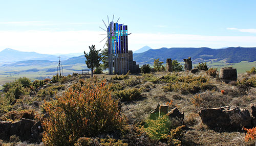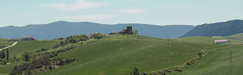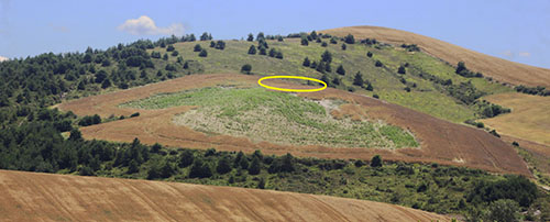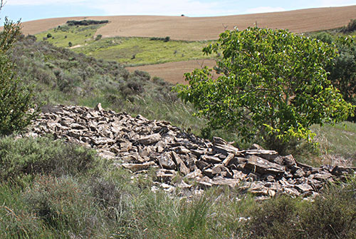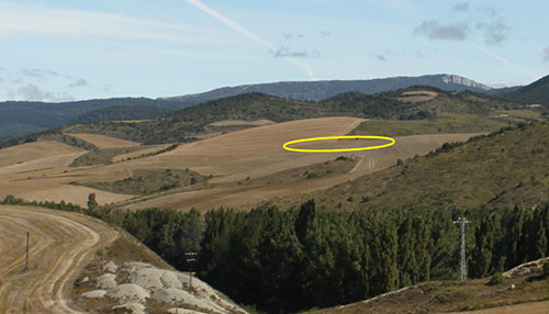 Muru. Parcela donde se encontraban los restos de Muru con su ubicación desde el W. Al fondo la cumbre de Montemuru.