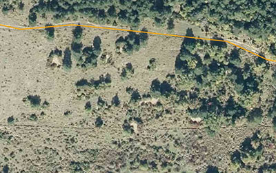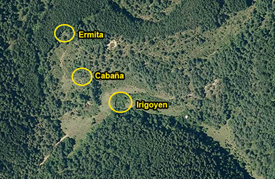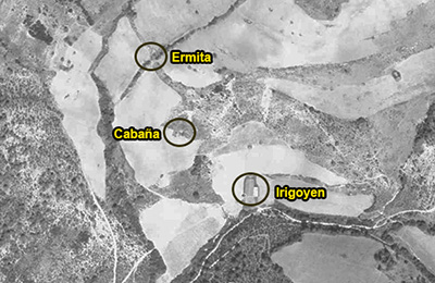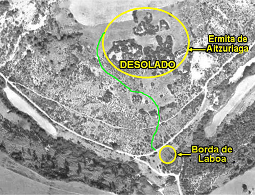 Aitzuriaga. Ortofoto SITNA 1927-34 Ubicación de las ruinas de la ermita del desolado y de la Borda de Laboa con el trazado de la senda que unía a ambas