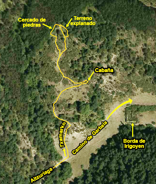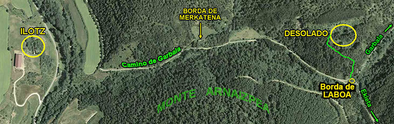 Este camino pasa bajo las ruinas de la borda de Merkatena (Merkatariarena) y al llegar a Aitzuriaga se bifurca para ascender uno a Garbala, al NE, y otro para ascender a Ekieta, al SE. Este espacio parece ser que era muy concurrido por la ganadería a juzgar por las bordas que existieron en el lugar: la ya mencionada de Mercatena, la de Laboa, pegada a las ruinas del desolado por el E, y la de Irigoyen poco más arriba en un pastizal en el camino a Garbala.