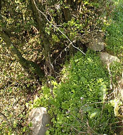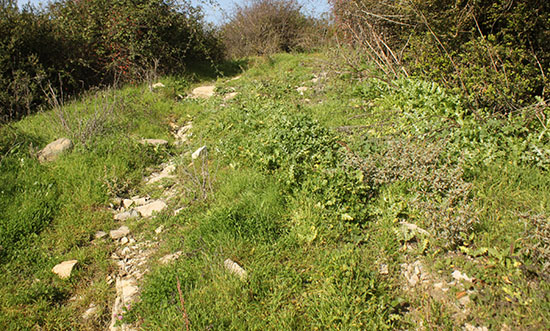 Txamarko. El camino hasta los restos de la Ermita de San Marcos. Estos consisten en un terreno evidentemente allanado en la ladera, cubierto de denso matorral, donde habría estado asentada la ermita, y en amontanamientos de piedras en hilera. Este terreno antiguamente se cultivaba y las parcelas estaban delimitadas y protegidas con cercados de piedras. Estas, o parte de estas, serían las piedras de los muros de la ermita, reutilizas con esta finalidad.