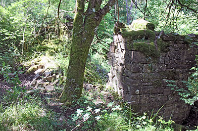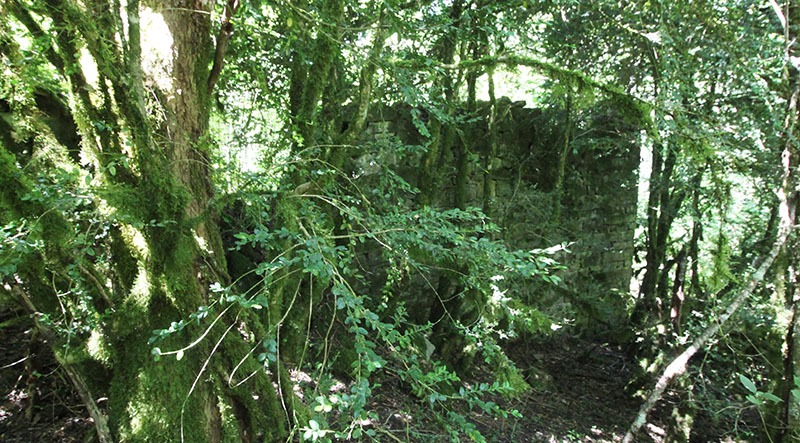 Unos cincuenta metros al N de estos, pegadas a la pista, encontramos las ruinas de un edificio (2), que por su tamaño pudo ser una vivienda, de la que no quedan restos de muros en pie, si acaso algún pequeño tramo de su base, sino montones de piedras cubiertas de musgo en gran parte.
