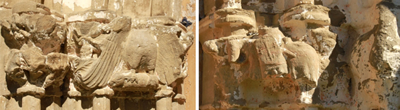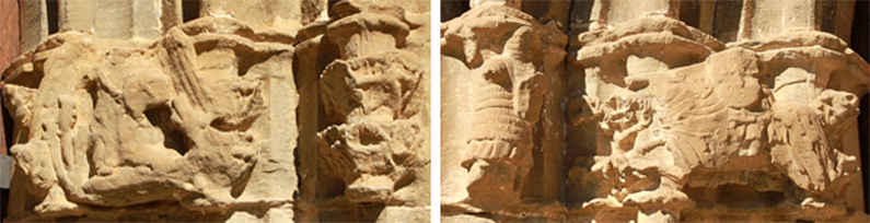 Los capiteles de las columnas de ambas portadas están unidos y adornados con diversas figuras, entre las que destacan un águila y un caballero, aunque contrariamente ubicados. Son muy similares a las de la portada de la iglesia de San Bartolomé de Larrángoz, en Lónguida y, al igual que en ésta, se encuentran muy deteriorados.