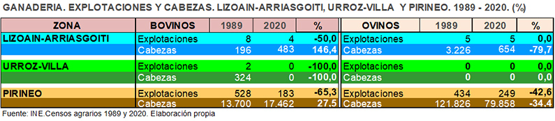 En Lizoain-Arriasgoiti las explotaciones de vacuno decrecieron en un 50,0%, sin embargo, las cabezas se incrementan en un 146,4%, fenómeno este que se produce en la Zona Pirineo. Es el proceso de concentración ganader al amaparo de los nuevos modos de alimentación, estabulación y pastoreo del ganado. El promedio de cabezas por explotación en 1989 era de 24,5, en la actualidad es de 120,1 cabezas por explotación. En Urroz-Villa, en este periodo han desaparecido las dos explotaciones que había, así como las cabezas que tenían.