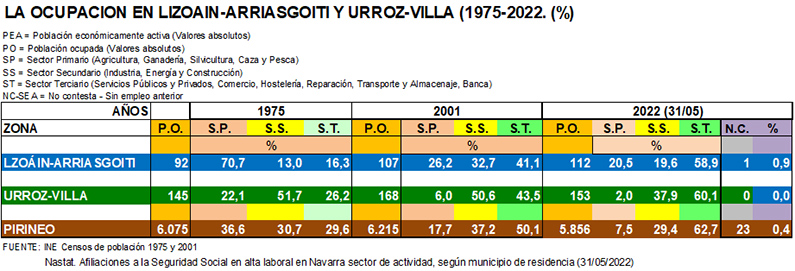 Estas transformaciones en la población y en el sistema de la economía tradicional se extendieron también a la ocupación de la población que había quedado en estos pueblos. Atendiendo a lo ocurrido entre 1975 y 2021 es patente esta situación, más en Lizoáin-Arriasgoiti, pero también en Urroz-Villa.