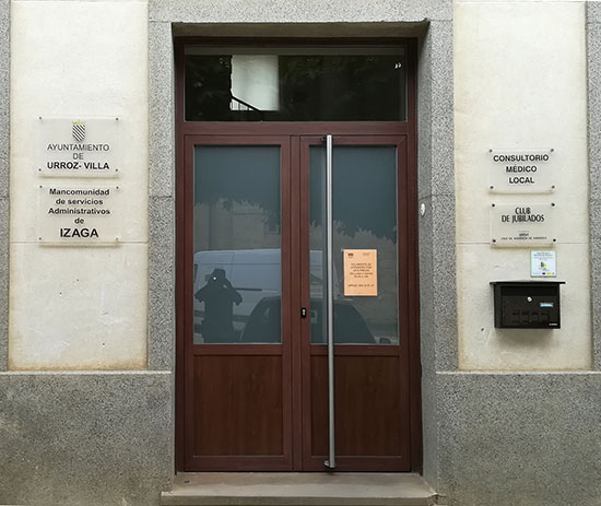 Urroz-Villa. Puerta de la Casa del Ayto. Sede de la Mancomunidad Izaga.