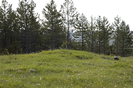 Continuando hacia el S, en el punto en el que llega al collado la pista que asciende desde Tres Mugas, existe otra manifestación de aspecto tumular. Es un túmulo de considerables dimensiones, más elevado por el W. Es un compuesto de tierra y de piedras, de las que varias sobresalen del pastizal que lo cubre. Está libre de vegetación y no tiene señales de haber sufrido excavación alguna.