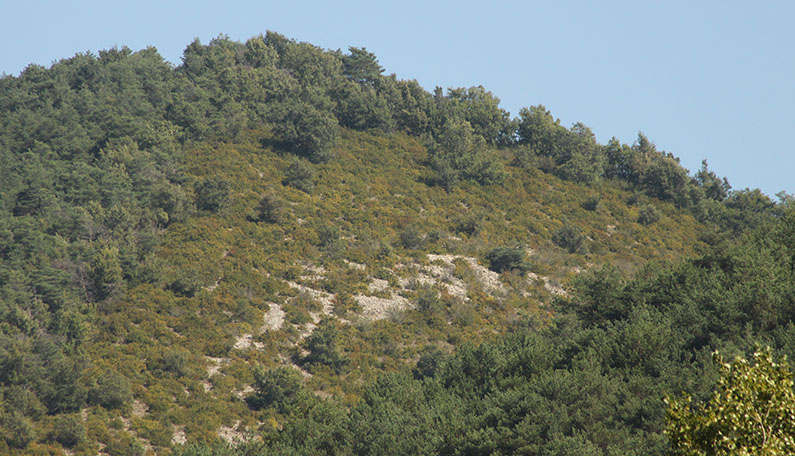 La Peña de Lakarri en el extremo N del collado. A la derecha el cortafuegos con las terrazas.