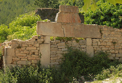Galdúroz. Dintel de una sola piedra entre las ruinas.                  Galdúroz. Pequeño rebaño de Cabras entre las ruinas
