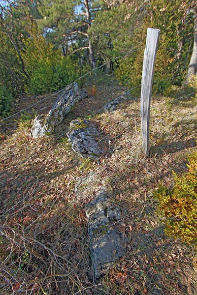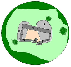 En lo más alto del túmulo aparecen distintas piedras que formarían parte de la cámara, hoy inexistente. De todas ellas destacan dos. La primera de ellas es la que sobresale. Está ubicada al W, hincada en tierra, erguida al NW y un tanto inclinada hacia el W. La segunda al E, recostada y hundida en tierra y dirigida al NE.
