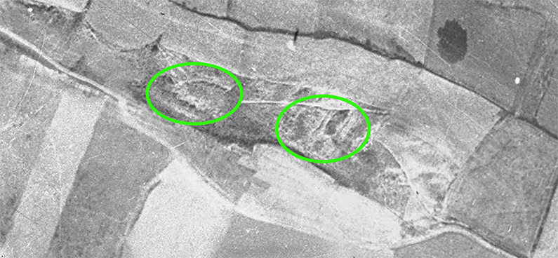 Sangibel. Ortofoto SITNA 1929. En verde posibles estructuras del PEH.