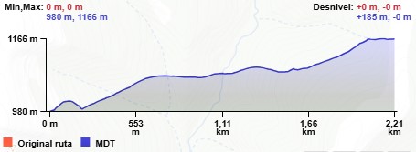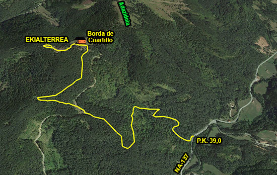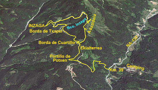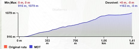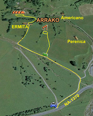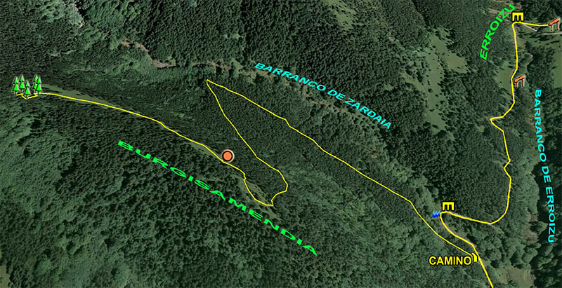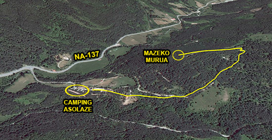 Para ello, cruzamos el camping de W a E en ligera ascensión y continuamos por el mencionado camino unos quinientos metros, donde el camino gira al NE y N, bordeando el monte Mazeko Murua por el E, a la vez que incrementa la pendiente hasta un puntal en espacio de bosque más abierto. Estamos a la altura de la cumbre.