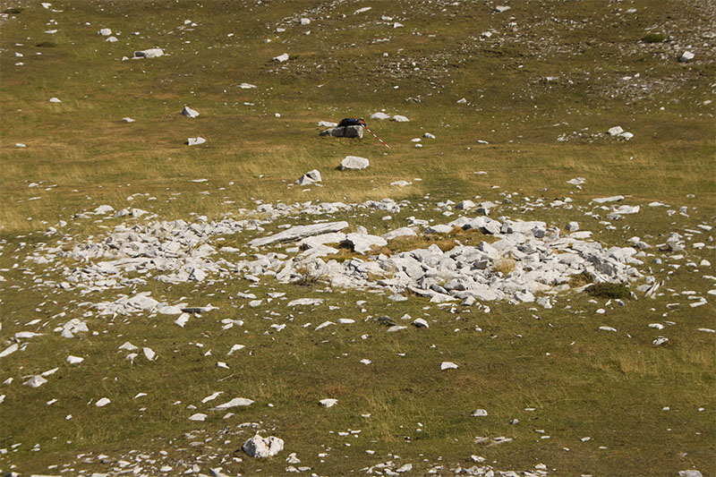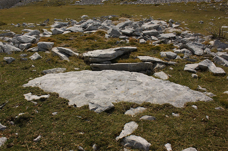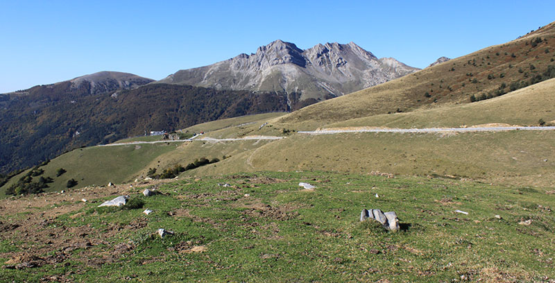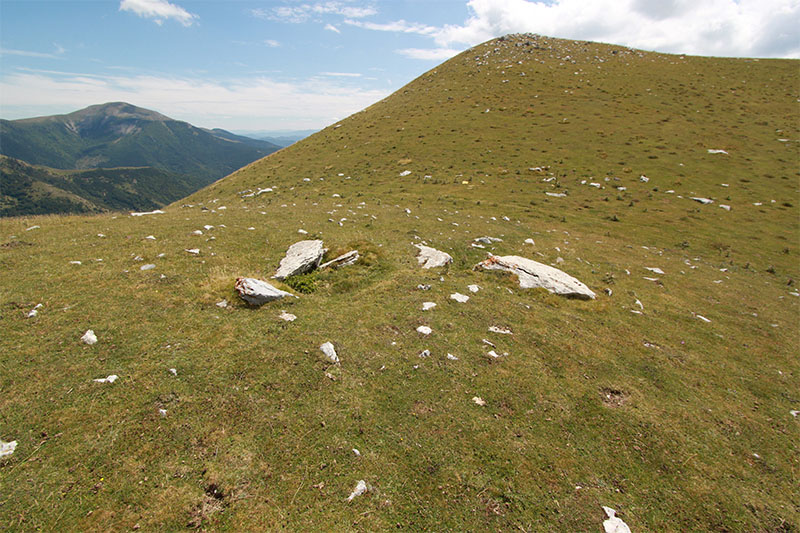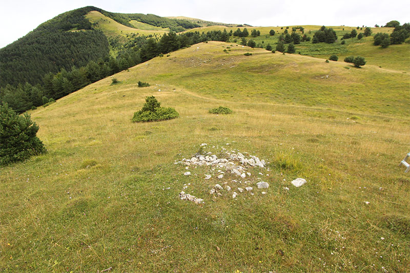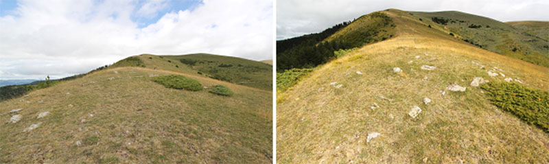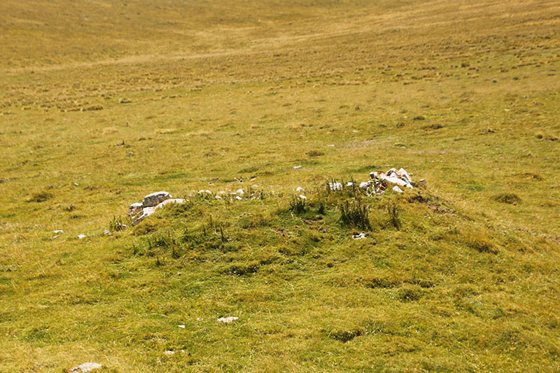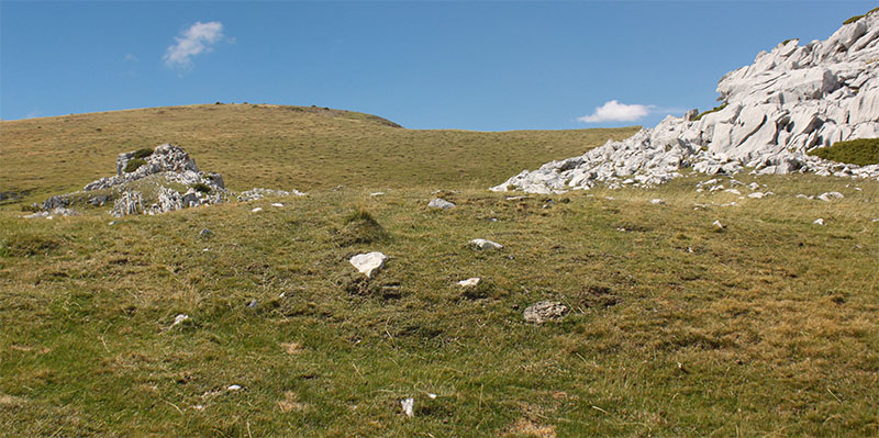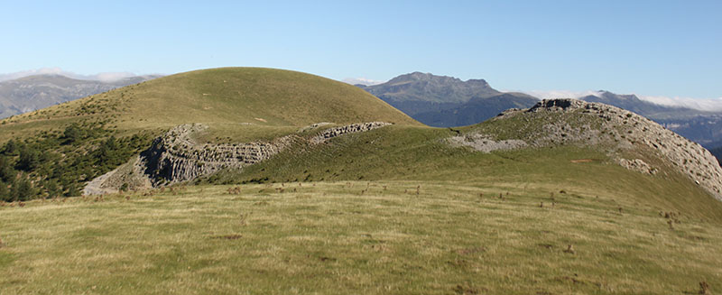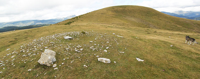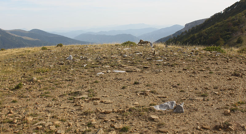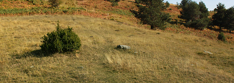 Nos olvidamos de la pista y tomamos un camino de rodadura que asciende por un cortafuego, abierto en el año 2009, a la pequeña cumbre de Larra. En lo alto de la rampa, donde se inicia esta prolongada cumbre, atravesado por el camino, vemos los restos del posible DOLMEN DE LARRA N?