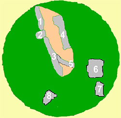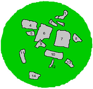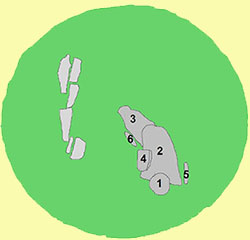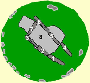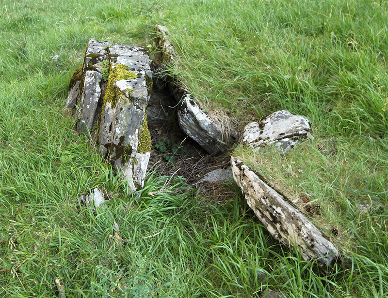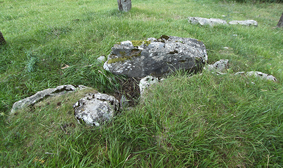 Las losas están muy removidas y fuera de su lugar, por lo que es difícil establecer la forma y composición de la cámara. La losa NW 1 parece ocupar su lugar, pues aparece enhiesta. Las losas 2 y la 3 son partes de una misma losa, de la que esta última se ha desprendido por la presión de la losa 4, bajo la cual se encuentra.. Podría ser que fueran la losa lateral NE.
