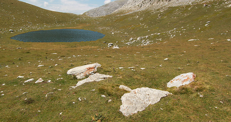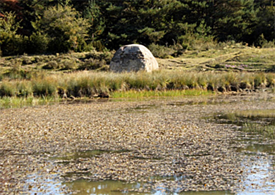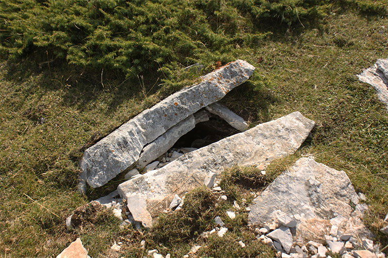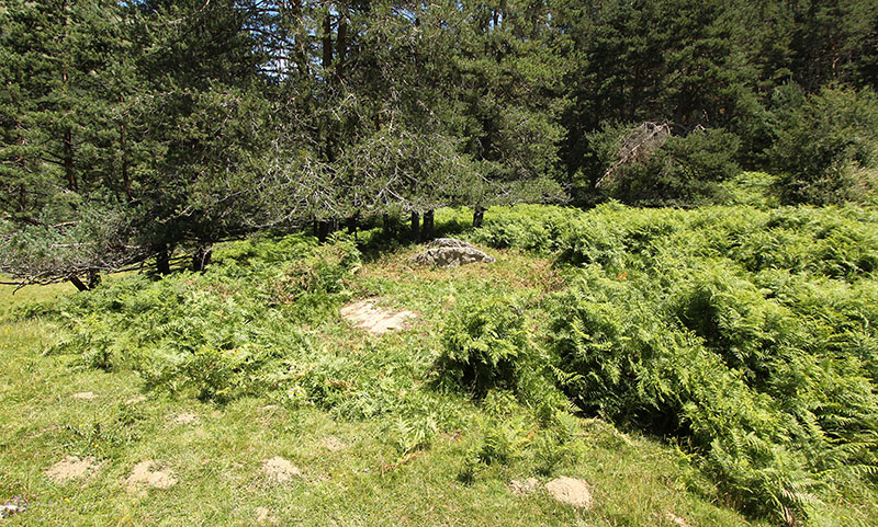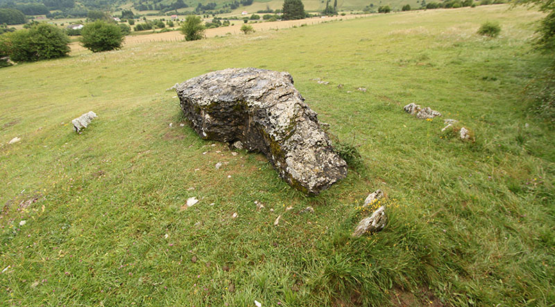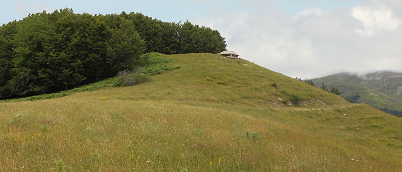 Continuamos el descenso por la pista hasta el cercano collado de Larra. Una balsa artificial con su depósito y abrevadero para el ganado son sus puntos de referencia. Cuarenta metros al SE del abrevadero hallamos el DOLMEN DE LARRA.