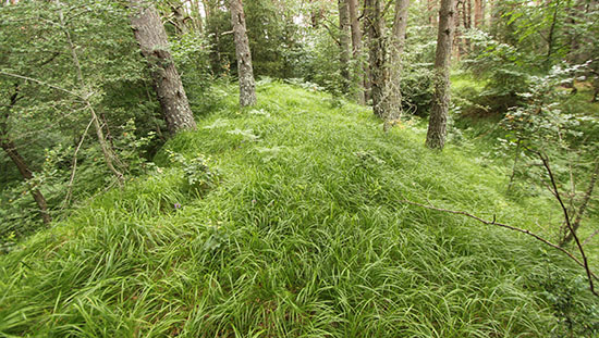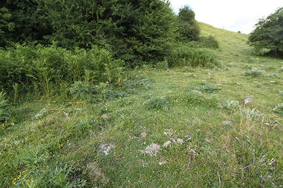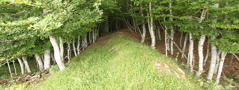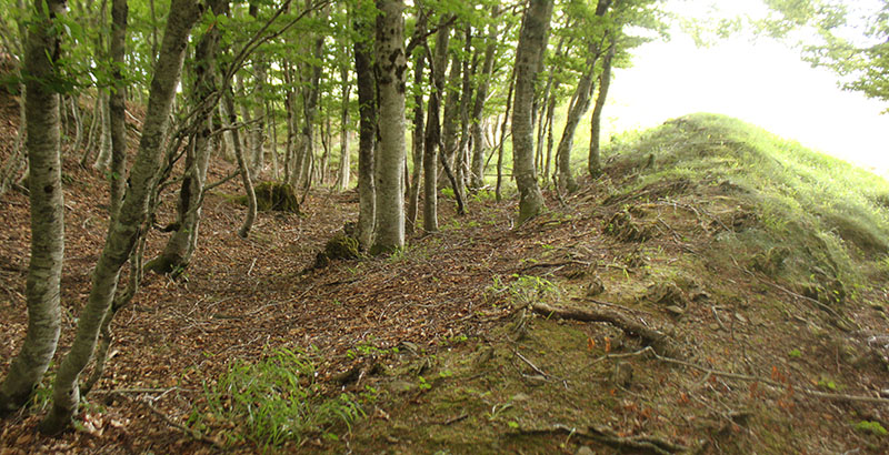 terraplén. Mazeko Murua. Potente caballón sobre el foso. Posiblemente oculte alguna muralla defensiva.