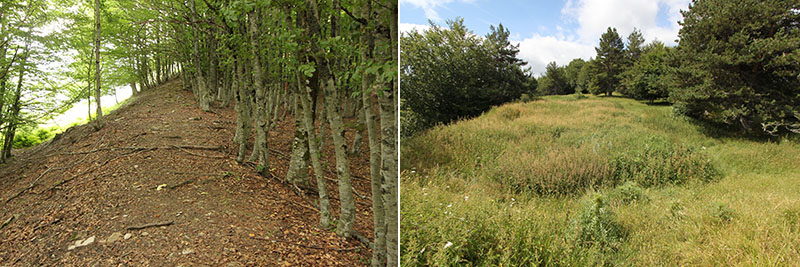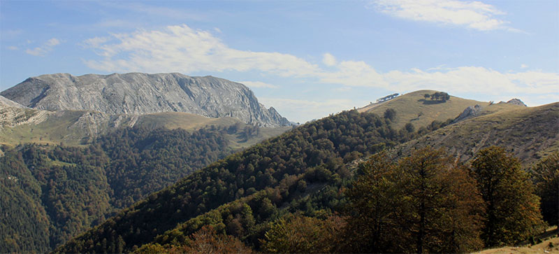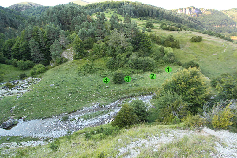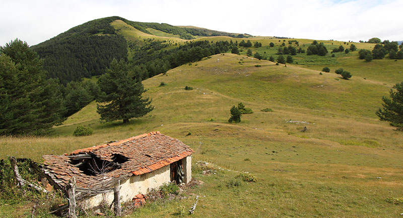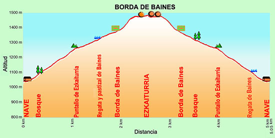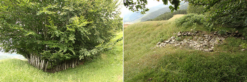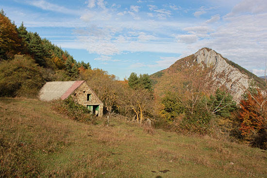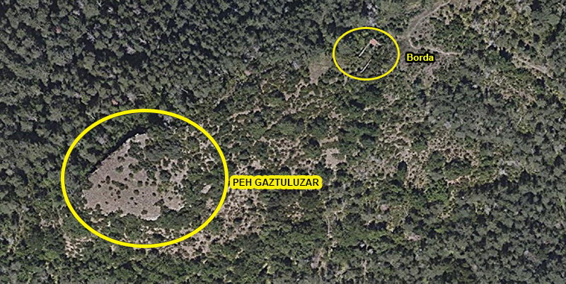 A partir de aquí lo hicimos caminando por el Camino de Sarastoia, un camino de rodadura que discurre por el interior de un bosque de pinos silvestres, mixto de hayas, de abetos y de tejos, que aparece a cielo abierto en algunos tramos de pastizal y que en un recorrido de poco más de dos kilómetros nos llevó a la cumbre de Punta Maisterra, un promontorio de pastizal donde se ubica el PEH. Antes de acceder al PEH, a sus pies hemos dejado una txabola y restos de la Borda de Osfihal.
