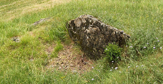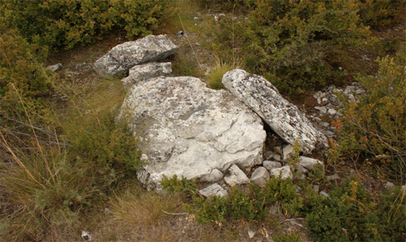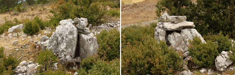 Los restos de este posible dolmen se hallan cien metros al N del anterior, pegado al camino de rodadura que recorre el cortafuegos, justo en el punto en que este alcanza la cima de la loma. La apertura de este cortafuegos es la que ha dejado al descubierto estos restos.