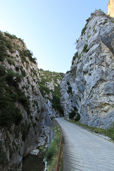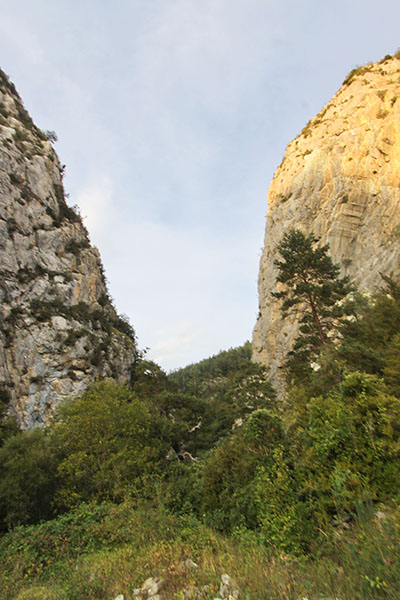Poco más arriba, en espacio abierto, pasamos por lar cercanías de los cortados rocosos de la foz de Burgui, donde la senda cambia rumbo al SE. La seguimos y alcanzamos en un buen trecho, un espacio de pastizal con abundantes matorrales, donde a la vegetación anterior se unen las hayas. Aquí la senda nos dibuja un zig-zag SW-SE por el que alcanzamos la pista asciende a la ermita de la Virgen de la Peña desde los pastizales de Sasi.