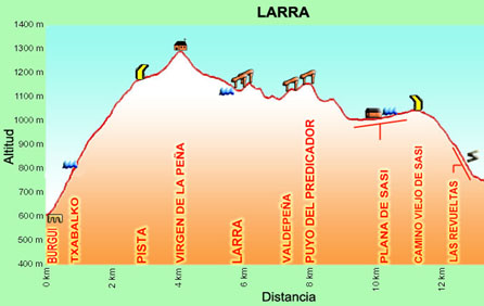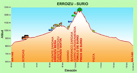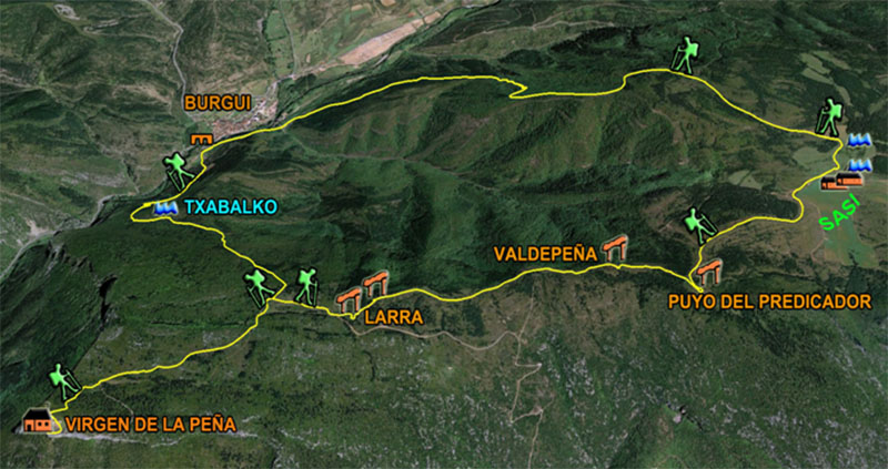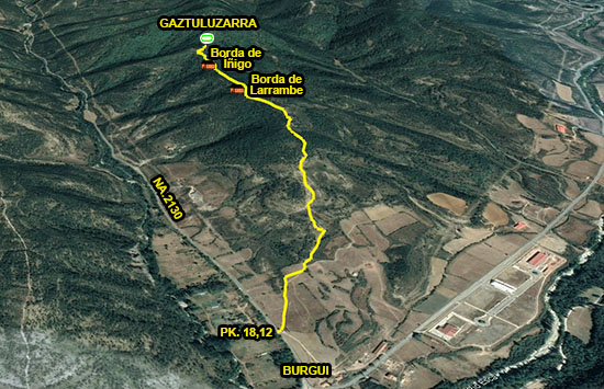 Partimos del puente medieval de Burgui, en la misma entrada al pueblo por la carretera NA-137, que proviene de Salvatierra de Esca (Aragón). Pasamos el puente y tomamos la dirección SW. A pocos metros dejamos a mano derecha una almadía de exposición y a mano izquierda una borda. Inmediatamente de pasar esta, tomamos la senda que inicia el ascenso en dirección S. Atravesamos el pinar de repoblación, incluida una pista que accede a un cercano repetidor de Tv. y continuamos ascendiendo en esta misma dirección, con alguna pequeña variante, entre pinos, robles y bojes con otras especies entre ellos, hasta el desvío a la fuente de Txabalko,