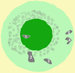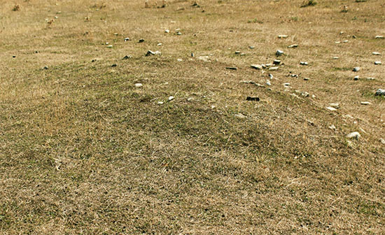 En el centro del túmulo presenta un cráter cubierto de hierba y con un matorral de zarzas en el interior. Muy posiblemente, este cráter habría sido excavado para la extracción de las losas de la cámara que estaría en este lugar.