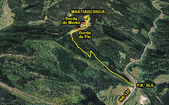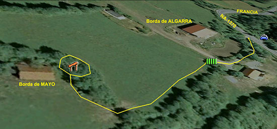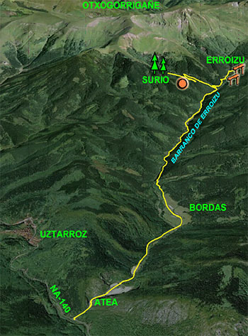 Partimos de Uztárroz por la NA-140 en dirección al Valle de Salazar por el Puerto de Laza. En el PK 50,17 tomamos una pista que se dirige al N-NE por el curso del Barranco de Burgiarte y que llega hasta los pies del alto cordal fronterizo con Francia de Orhi a Belagua. La pista se situa al S de las cumbres de Otsogorritxikia y Otsogorrigaina, un espacio donde antiguamente se ubicaban varias bordas y hoy día sólo quedan dos naves ganaderas.