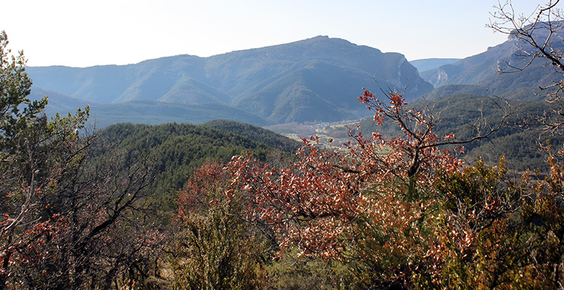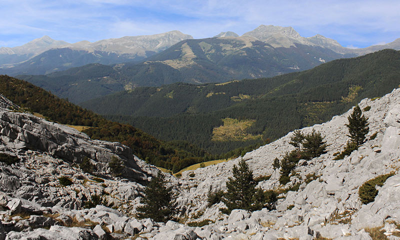 El paisaje de la ladera N de esta sierra, por donde discurre la senda de acceso, lo componen el bosque de pino laricio en la base, posteriormente aparecen los pinos silvestres y los robles pubescentes, con avellanos, espinos, serbaales y arces diseminados. Conforme el terreno se acerca hacia los altos de la sierra aparecen los hayedos. Los bojerales ocupan grandes espacios, bien al descubierto o bien como sotobosque de los pinares, robledales y hayedos.