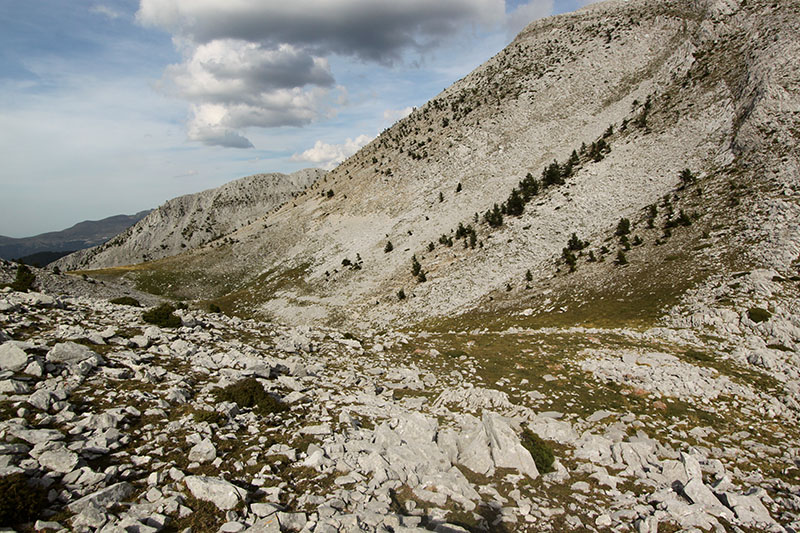 Regresamos al cortafuegos y seguimos el camino al NE, inicialmente en descenso y posteriormente por terreno llano, hasta alcanzar la plana de Sasi.