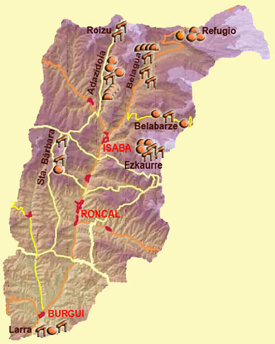 En el Valle de Roncal se localizan diversas estaciones megalíticas. La mayoría de ellas están localizadas al norte del valle. Estas son las del Refugio, Belagua, Roizu y Adazidoia. Al E se encuentran las de Belabarce y Ezkaurre. Por el W se encuentra la de Santa Bárbara. En el extremo S se halla la de Larra en Burgui. La estación de Orhi-Otxogorrigañe se ubica en término limítrofe de los valles de Roncal y de Salazar, correspondiendo al primero el mayor número de monumentos. No obstante, como el acceso se propone desde el Valle de Salazar y dos de sus monumentos se ubican en su término, la estación se incluye en este último valle. Estas estaciones contienen distintos tipos de megalitos, como dólmenes, túmulos y fondos de cabaña. Solamente tiene un cromlech y hasta la fecha no se ha localizado ningún menhir. El estado de conservación es muy dispar. Hay algunos muy bien conservados, caso del muy conocido dolmen de Arrako, y otros en estado ruinoso, meros vestigios de la existencia de alguno de estos monumentos. |