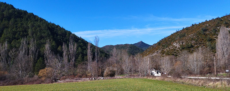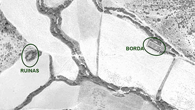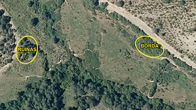 Es conocido el hecho en siglos pasados de que cuando se abandonaba un poblado, se trasladaban las personas, no las tierras ni los ganados, lo que provocó el hecho de que empezaran a aparecer bordas donde antes había casas y que en muchos casos se construían con los materiales (piedra y madera) de las casas abandonadas, lo que explicaría la existencia de esta borda y de las muchas como ésta que existen por toda la Zona Pirineo Uscarrés. Canales. Entre la maleza se ve el muro de ls borda cubierto de musgo. Respecto a las ruinas de una casa, esta se ubicaba en la margen derecha del barranco, en el límite con el pinar que se eleva ladera arriba. Era invierno y no pudimos visitarlas a causa del gran caudal del barranco y del barrizal del entorno. Volveremos en verano para cerciorarnos. Pero sí es muy evidente por el ortofoto de 1927 que se trata de unas ruinas desoladas, como se ven otras muchas en el SITNA histórico de 1927-34. |