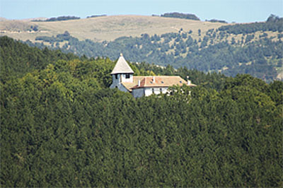 con tres arquivoltas y guardalluvias, ventanas en aspillera, tejado