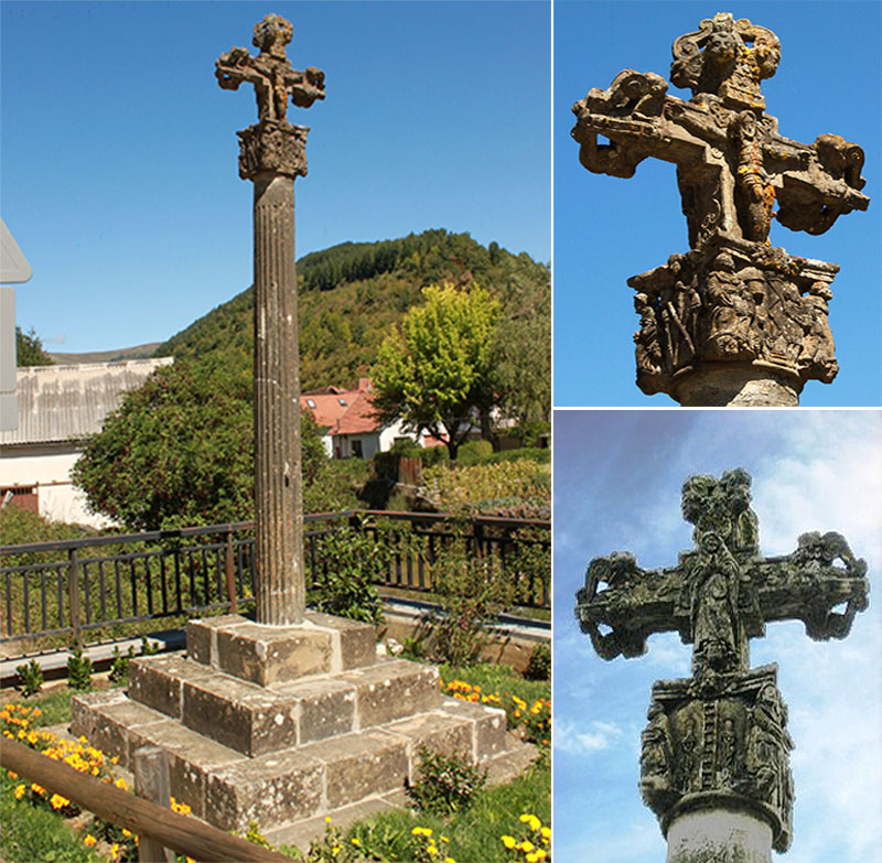 Los Cruceros. Un último detalle artístico del valle son los cruceros. En el Valle de Salazar solamente hay uno, el crucero de Ochagavia, ubicado junto a la carretera de entrada al pueblo, donde se unen los ríos Zatoia y Anduña para formar el Salazar. Se trata de un crucero del S. XVI, con pedestal cuadrado con base y triple escalón, sobria y robusta columna dórica, capitel cúbico con figuras de los evangelistas en las esquinas y distintos símbolos de la pasión de Cristo en las caras. Sobre el capitel la cruz decorada con volutas caladas en sus extremos con el Crucificado en lacara frontal y la Virgen en la reversa.