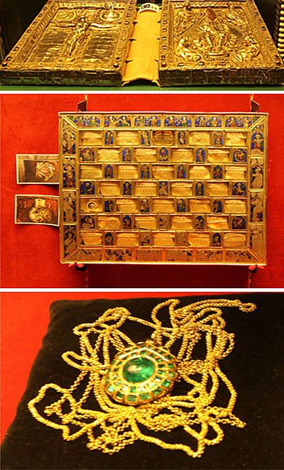 El "Ajedrez de Carlomagno", es una pieza llamada así por su disposición en damero. Pertenece cronológica y estilísticamente al gótico de la segunda mitad del siglo XIV. Realizado sobre una base de madera forrada de láminas de plata parcialmente dorada, esmaltes translúcidos y vidrio. Por último, está la famosa esmeralda de Miramamolín, indentificada, según la leyenda, con la que Sancho VII el Fuerte arrebató del turbante al rey moro en la Batalla de las Navas, a raíz de la cual se incorporó, como un símbolo, al escudo de Navarra.