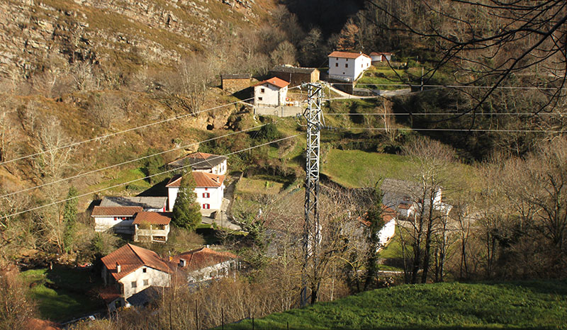 No está estructurado en torno a un núcleo de población, sino que es un espacio en el que se ubican varios caseríos que cuentan con sus casas, huertos, dependencias y praderas para el ganado, que es su actidad económica.