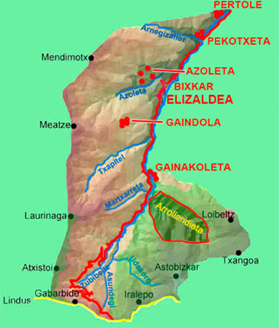 Es un espacio muy similar al de Azoleta. Se compone de varios caseríos y bordas diseminados, asentados en la ladera y dedicados a la ganadería. Pekotxeta. Caseríos de Maixterrarenea y Xaindurenea