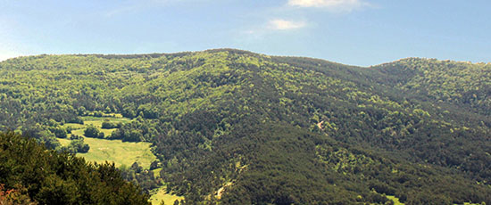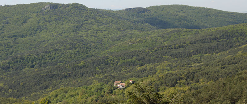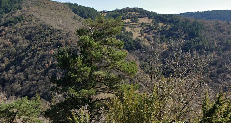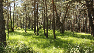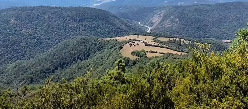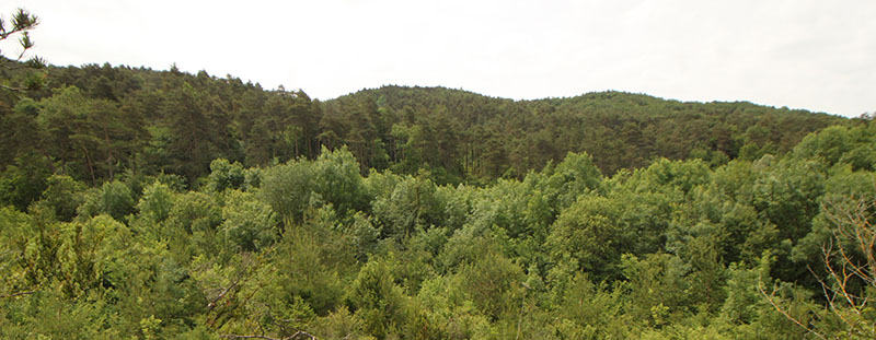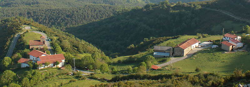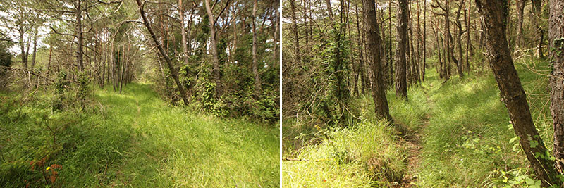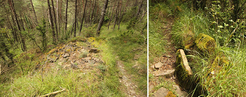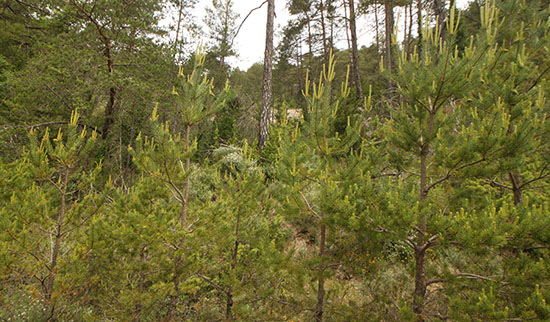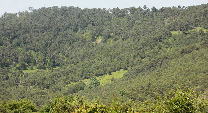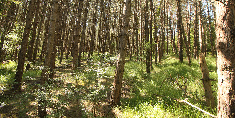 Elixaxarreta. Pinos repoblados. En el claro del fondo en espacio claro están los restos mencionados. |