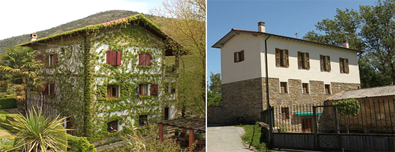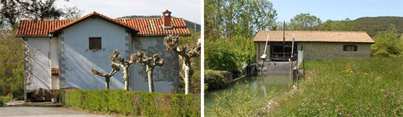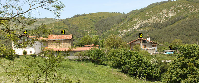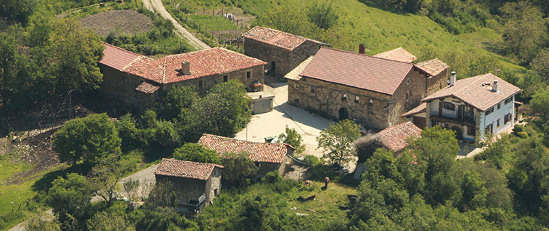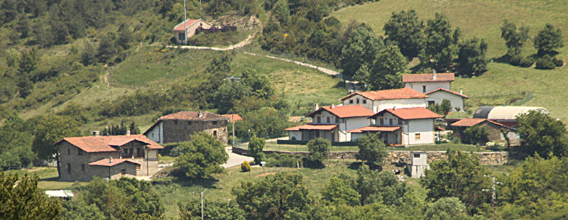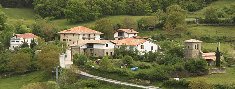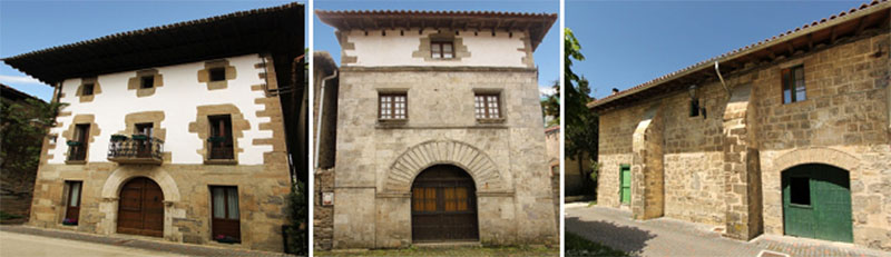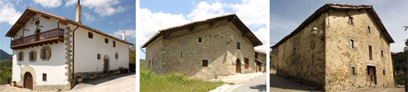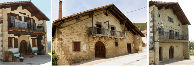 Las casas son de dos o tres plantas, con cubiertas de teja a dos o cuatro aguas. Los tradicionales usos de cada una de las plantas se han transformado. Anteriormente cada una de las plantas de la casa ejercía una función. Hoy día, aunque la estructura externa de la casa permanece, la disposición y uso de los espacios han cambiado y han sido adaptados más a los usos urbanos modernos que a los rurales tradicionales. Así la antigua cocina ha sido sustituida por cocina y sala de estar, las antiguas entradas por halls de recepción, los establos por garajes, txokos, etc.