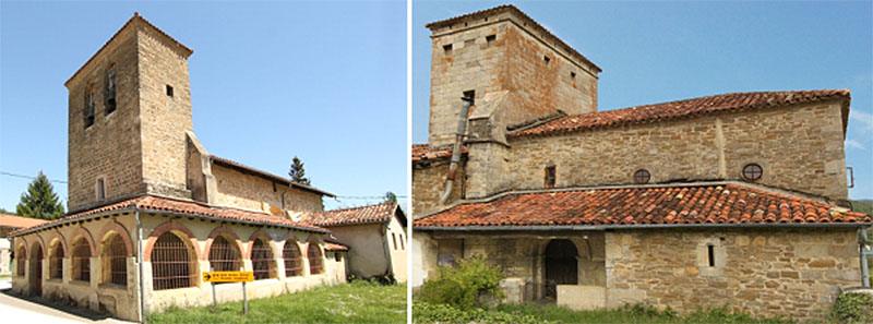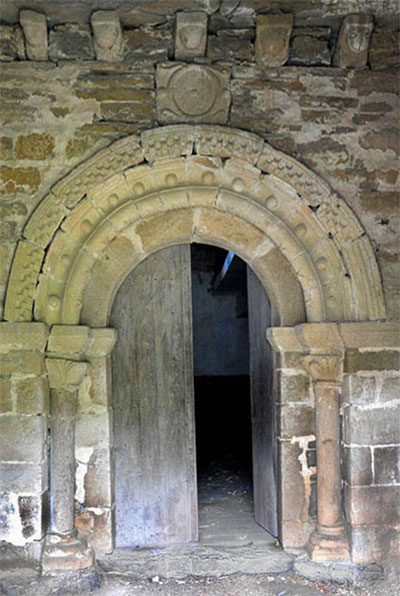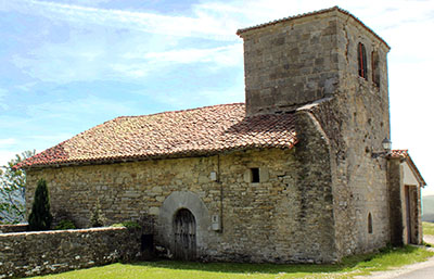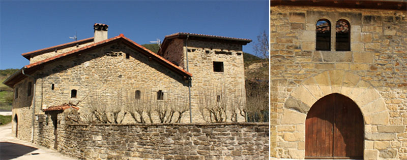 Es románica, del S. XII, que conserva la portada original dentro de un portico con acceso del lado N del edificio. Esta portada, que no se ve desde el exterior, se compone de un guardalluvias ajedrezado que protege tres arquivoltas, la primera baquetonada y adornada con pomos, la segunda es voluminosa y lisa y la tercera, también lisa, forma el arco de medio punto de la puerta. Este conjunto descansa sobre una imposta con decoración geométrica apoyada sobre dos columnas lisas con capiteles decorados decorados con palmetas, sustentados por columnas. Sobre la portada hay una piedra esculpida con un círculo de difícil interpretación. Un tejaroz apoyado sobre siete canecillos con cabezas de animales muy toscamente labrados, cubre el conjunto.