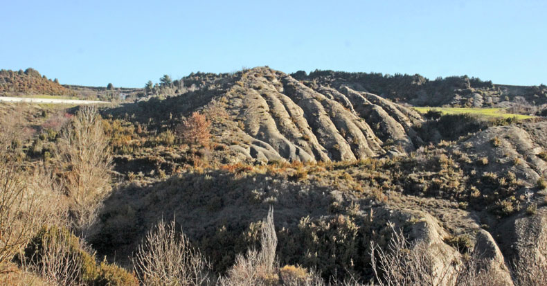 Lumbier. Formación de terrazas en las margas de la cuenca. Hasta Lumbier llega, aunque sensiblemente rebajada, la gran terraza del Irati que recorre el valle de Lónguida y Urraúl Bajo hasta alcanzar Lumbier y finalizar en el curso del río Salazar.