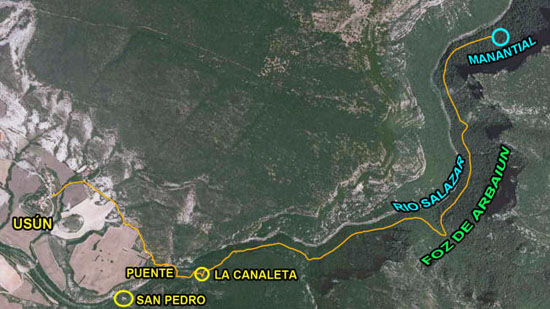 El río Salazar deja atrás el poblado de Lumbier pasando sus aguas bajo el Puente de las Cabras, de arquitectura medieval, y bajo el Puente de Hierro, construido a principios del S. XX para la vía del tren Irati y hoy totalmente remodelado, pero para su recuerdo en la entrada del puente nuevo está expuesto un pequeño tramo del puente original. A poco más un kilómetro hacia el S el río Salazar vierte sus aguas al río Irati en el cercano paraje hortícola de Baiakua, antes de que éste alcance el cañón de la Foz de Lumbier.