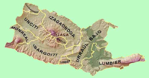 Iniciamos el recorrido de la Zona Pirineo por los valles y municipios meridionales de su territorio. Todos ellos están ubicados íntegramente en terreno de la Cuenca de Lumbier-Aoiz y en el entorno de la Sierra de Izaga, a la que circundan. Estos son los municipios simples de Lumbier y Monreal y los municipios compuestos de los valles de Urraúl Bajo, Izagaondoa, Unciti e IbargoitI. |