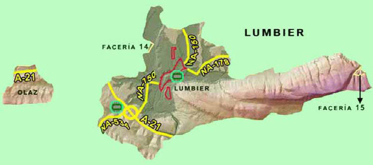 Llegamos a Lumbier desde Pamplona por la Autovía del Pirineo (A-21). En la Venta de Judas tomamos la salida 35 y nos dirigimos a Lumbier por la NA-150 en un trayecto de 2,4 km.