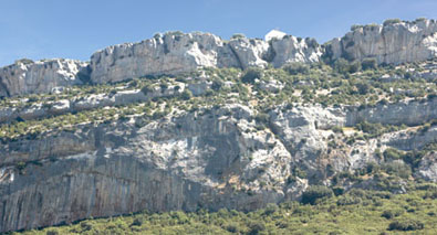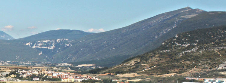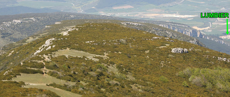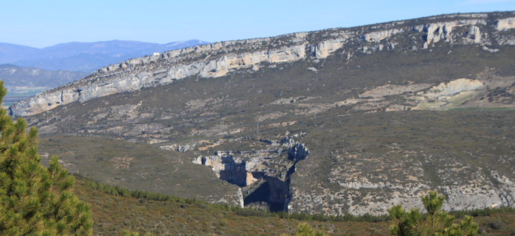 Otro detalle que vemos es una proyección rocosa que se desprende de la cumbre de Romastaca, la más occidental de la Sierra de Leire, hacia el pueblo de Lumbier, con sendas cadenas de farallones rocosos por el E y por el W. Son los componentes de la Reserva Natural de los Acantilados de La Piedra y de San Adrián,