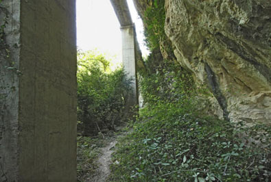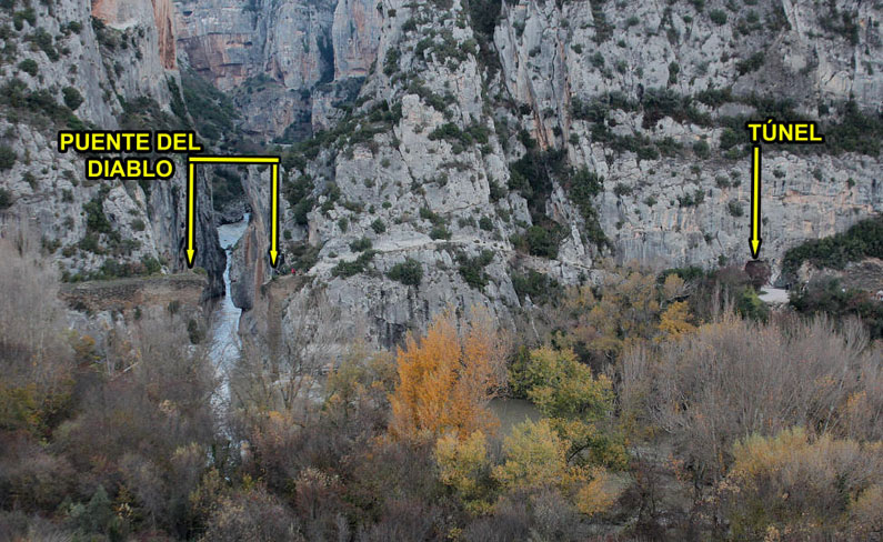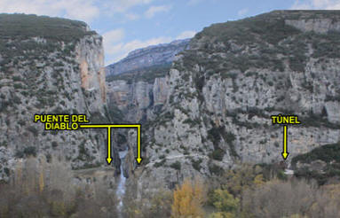 Para salir de la foz fue necesario excavar un nuevo túnel en la roca para salvar la garganta del Puente del Diablo y salir siguiendo la vía al municipio de Liédena.