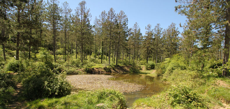 etc.) y pinos silvestres diseminados por ella. Dos pequeñas