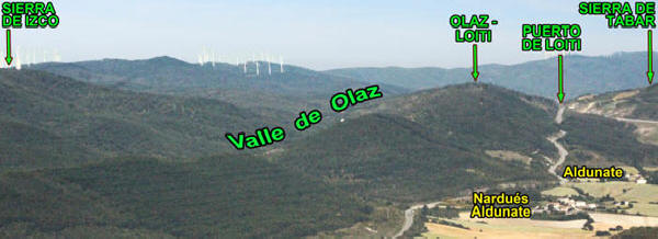 El enclave de Olaz. Es la tercera parte del territorio de Lumbier. Se trata de un enclave que ocupa la ladera N de la Sierra de Izco, desde la cumbre de la sierra, que hace muga con el municipio de Aibar, hasta el cerro de la ladera S de la Sierra de Tabar, donde se sitúa la muga con Ibargoiti, dejando de por medio el entorno del Puerto de Loiti. Al E limita con Urraúl Bajo y al W con Ibargoiti.