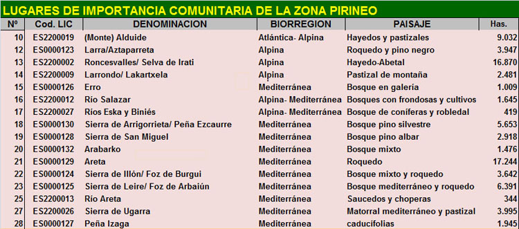 Además el Gobierno de Navarra propuso 42 LICs (Lugares de Interés Comunitario) para su integración en la Red Natura 2000, creada por la Unión Europea para la conservación de la diversidad biológica. Todos ellos hoy día están declarados como ZEC (Zonas es Especial Conservación). La LEY FORAL 9/1996, de 17 de junio, de espacios naturales de Navarra establecía una definición de estos espacios, así como su demarcación.