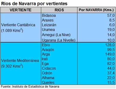 La Vertiente Mediterránea: Todo el territorio de Navarra que desagua en el Mediterráneo (9.302,08 Km2) lo hace a través del río Ebro, al que llegan a través de diversos afluentes, como el Ega, Arga Y Aragón. Las precipitaciones son muy variables durante el año, generalmente escasas en verano y más abundantes en invierno. Los ríos son bastante más largos que los del Cantábrico y presentan caudales mayores y cuencas más amplias. El río Ebro casi duplica el caudal en su transcurso por Navarra, pasando de los 137,5 m3/seg. en Mendavia, a los 237,08 m3/ seg. en Castejón.